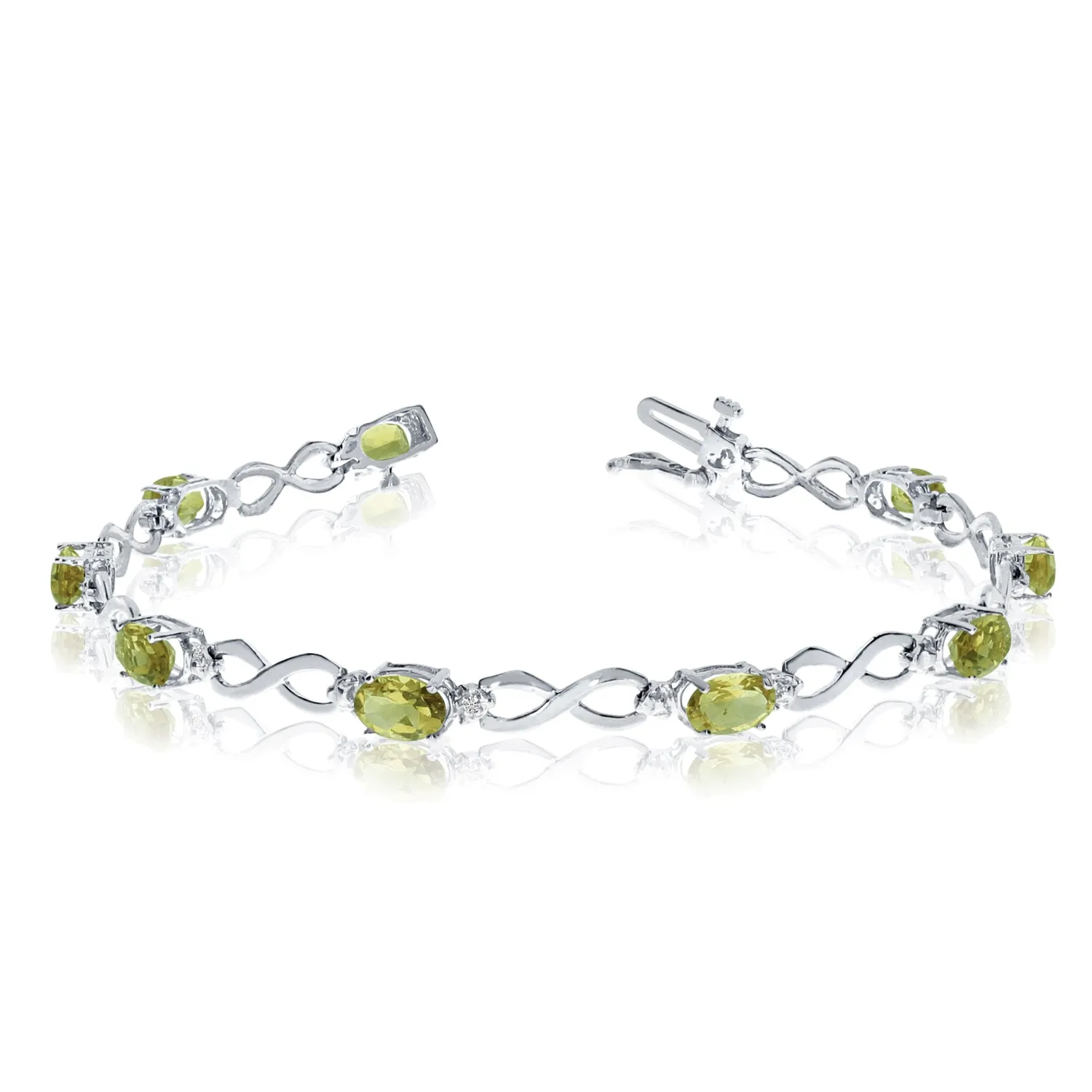 This 10k white gold oval peridot and diamond bracelet features nine 6x4 mm stunning natural peridot stones with a 3.60 ct total gem weight.