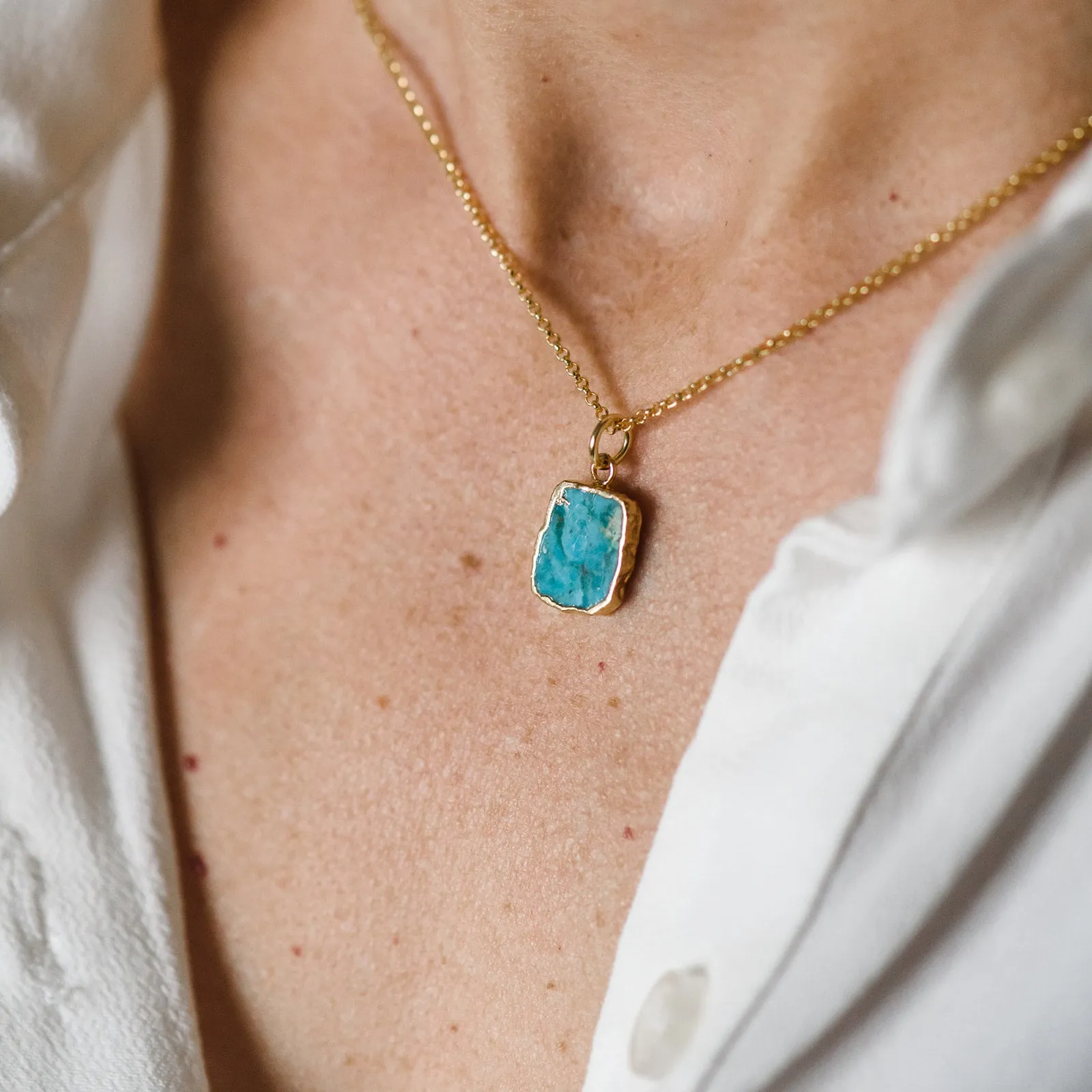 A genuine turquoise stone slice hangs from a 16-18" gold filled chain to create this dainty pendant necklace. Perfect for the lover of all things turquoise as this makes a simple daily necklace or wear it layered for a larger impact. Finish the look with our Amazonite double point studs!
